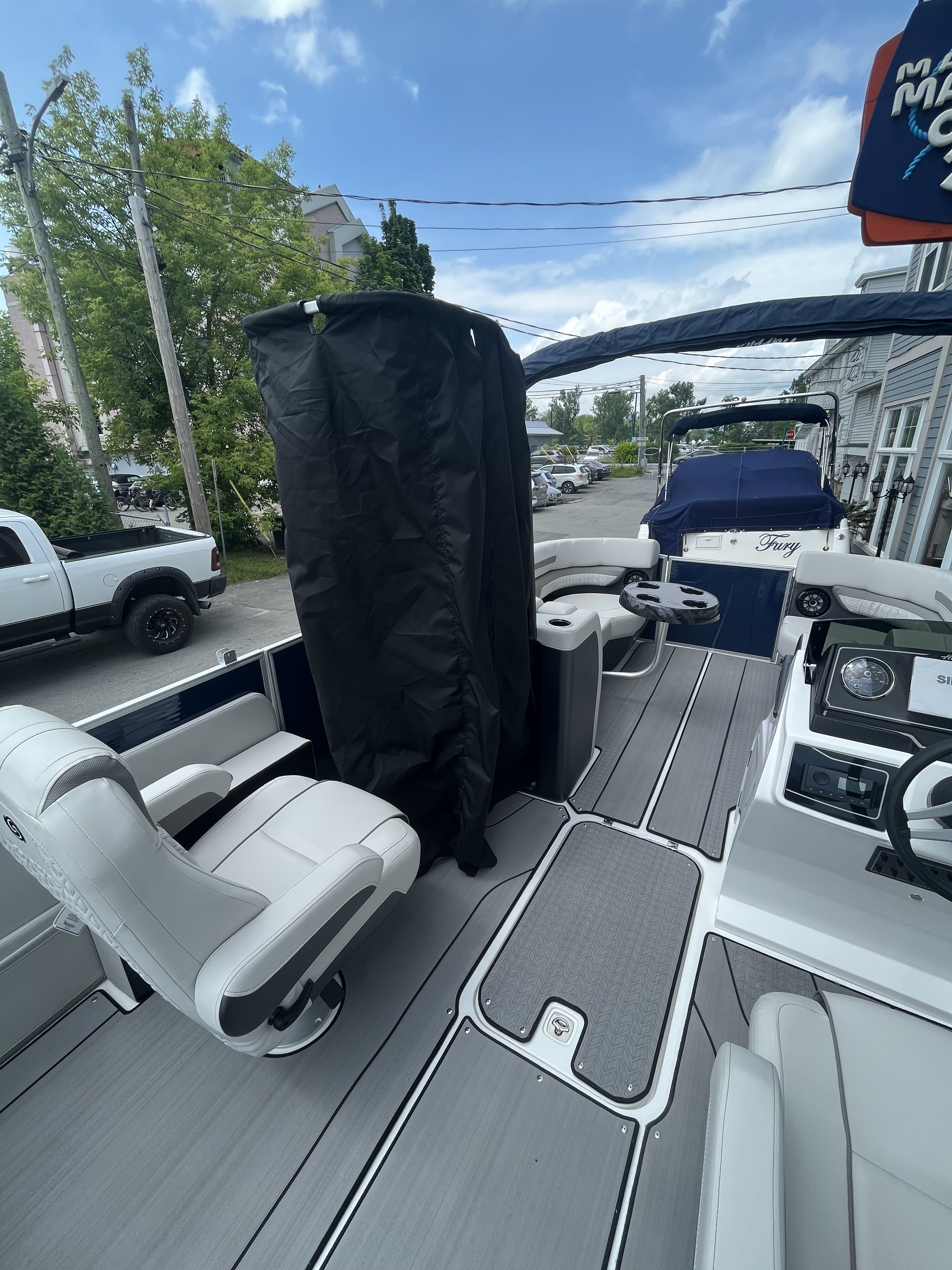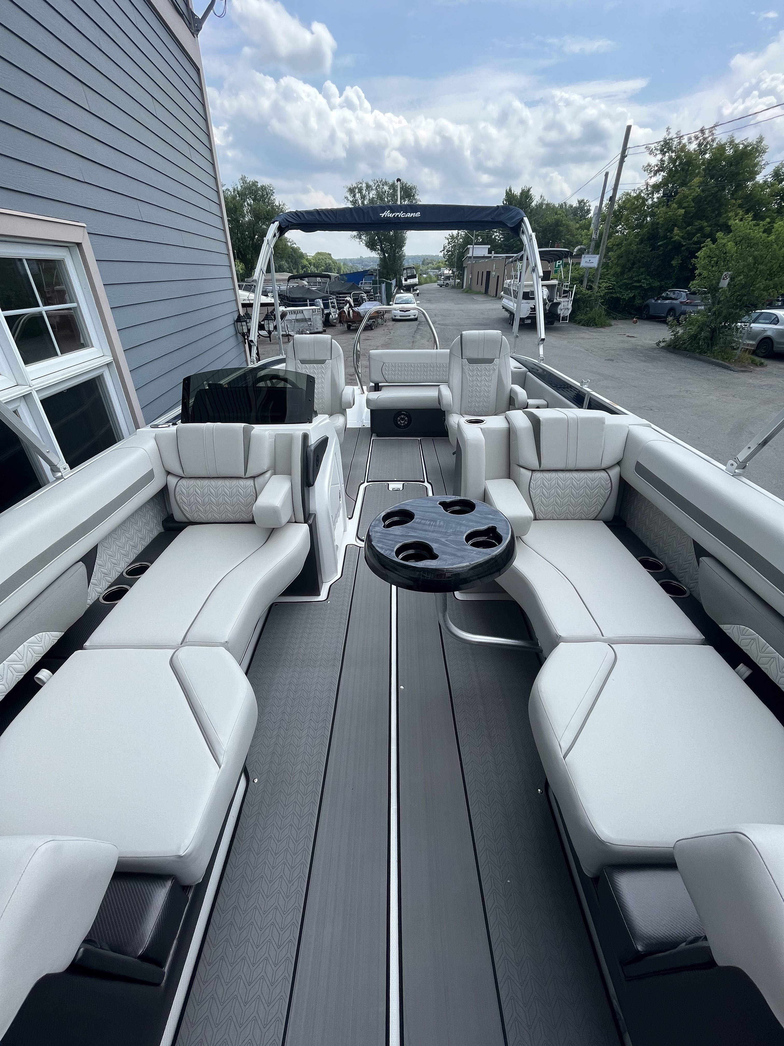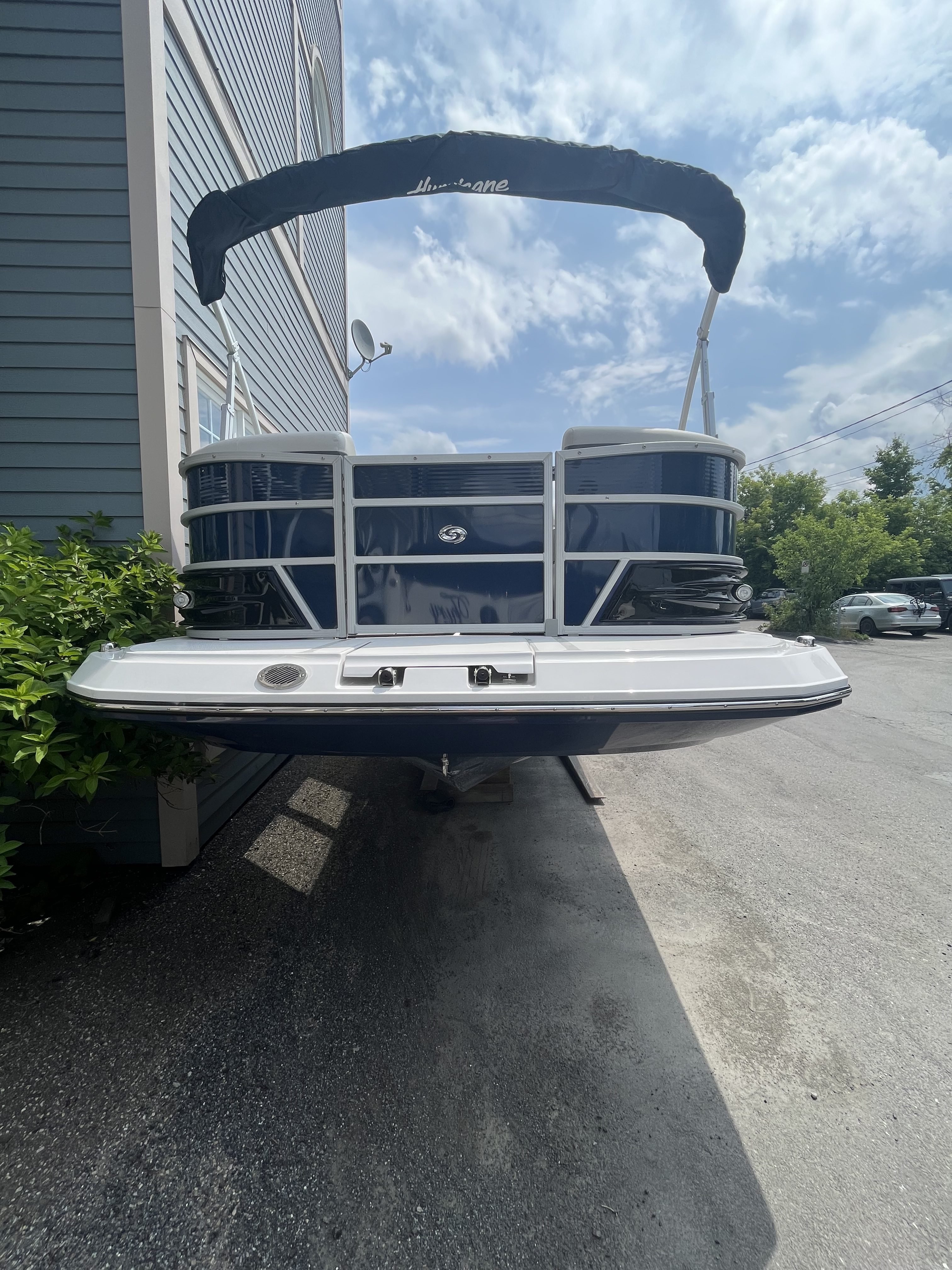 Ponton Hurricane FunDeck 2360-SFL3-OB de couleur Monaco Bleu. Avec sa construction de coque de bateau, vous pourrez profiter de l’espace intérieur réservé au ponton avec la conduite d’un bateau. Son intérieur de couleur Sport Ice Gray et sa banquette arrière avec dossier amovible vous permettra de profiter des belles journées ensoleillées.