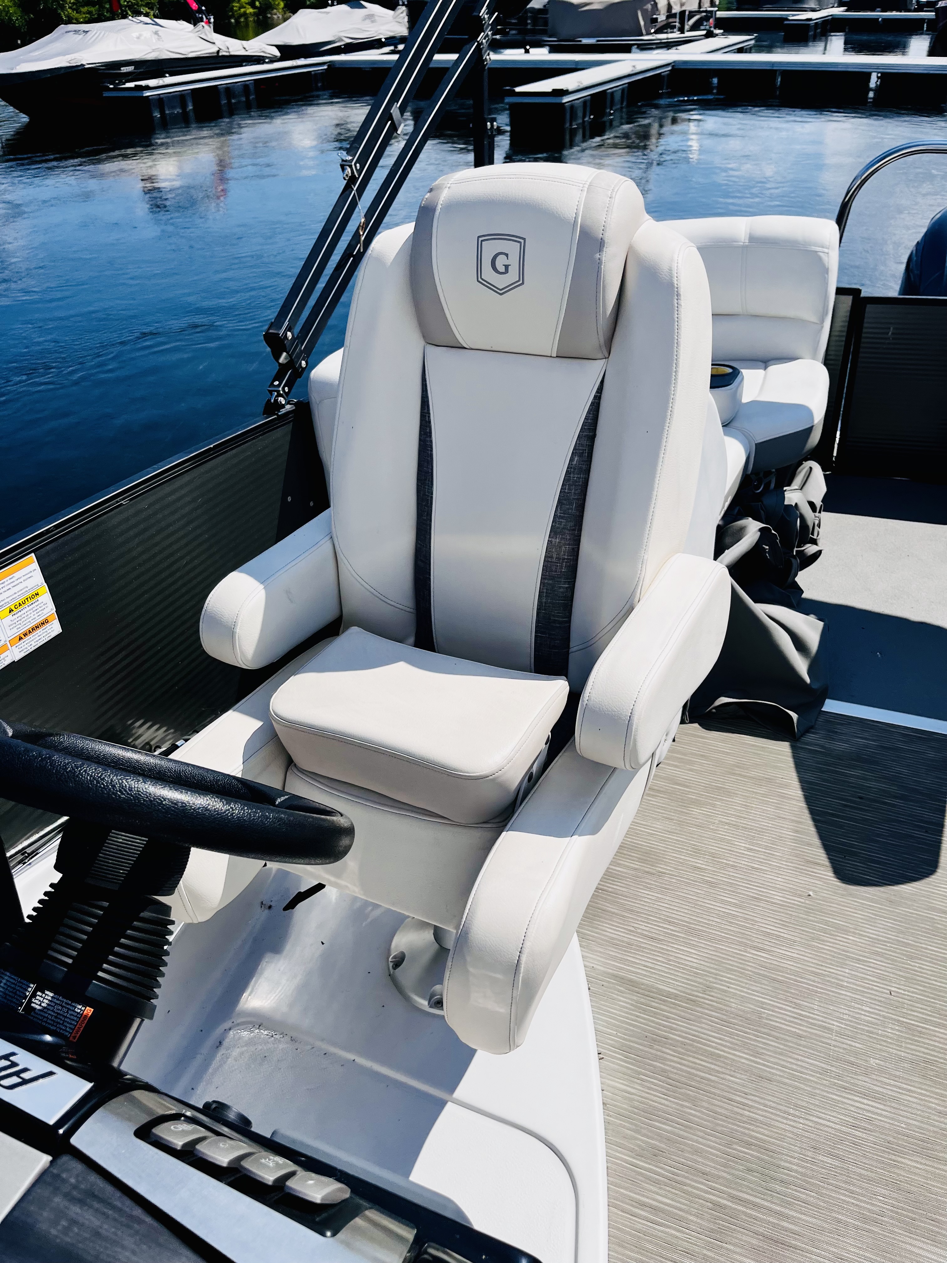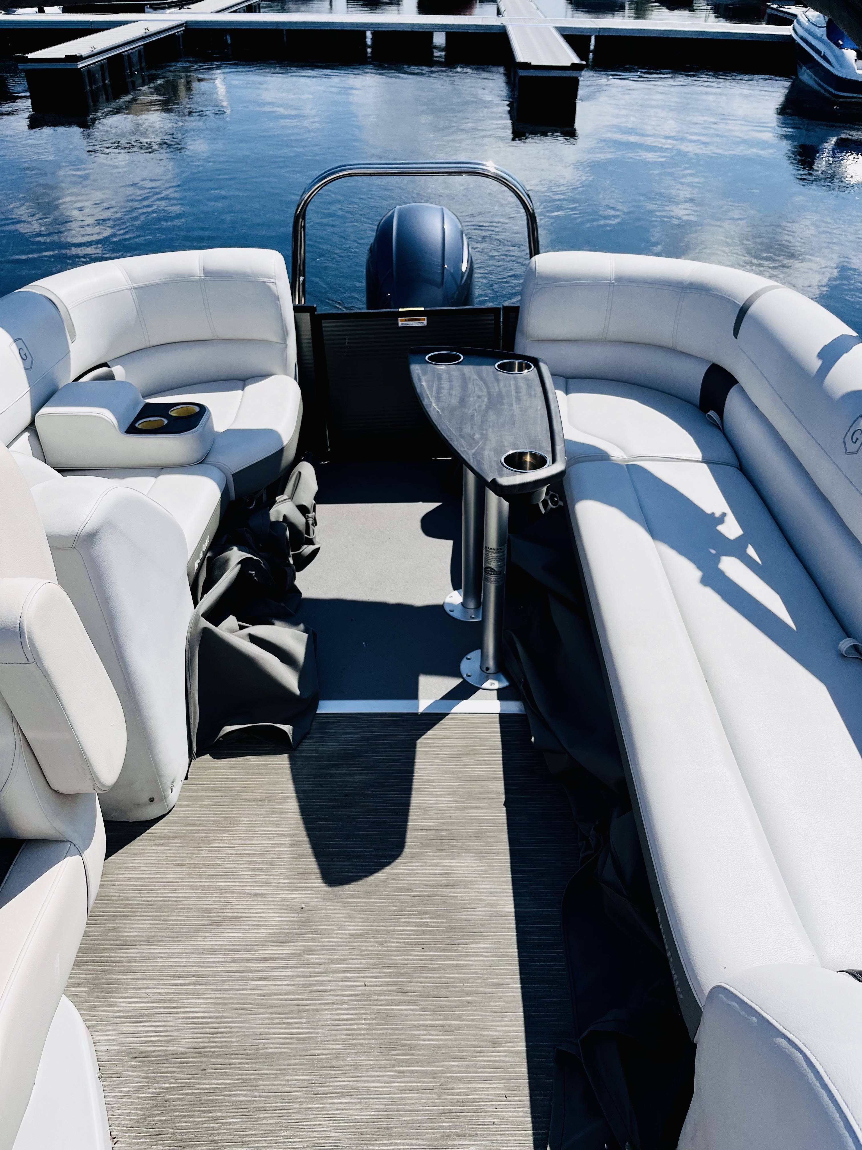Ponton Godfrey Aquapatio 235SB, 2017, 24 pieds, 2 quilles couleur gris et blanc