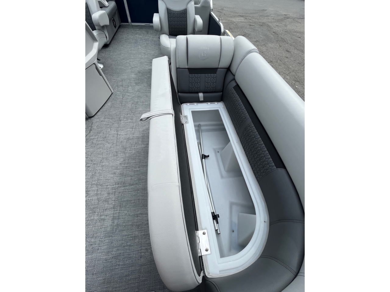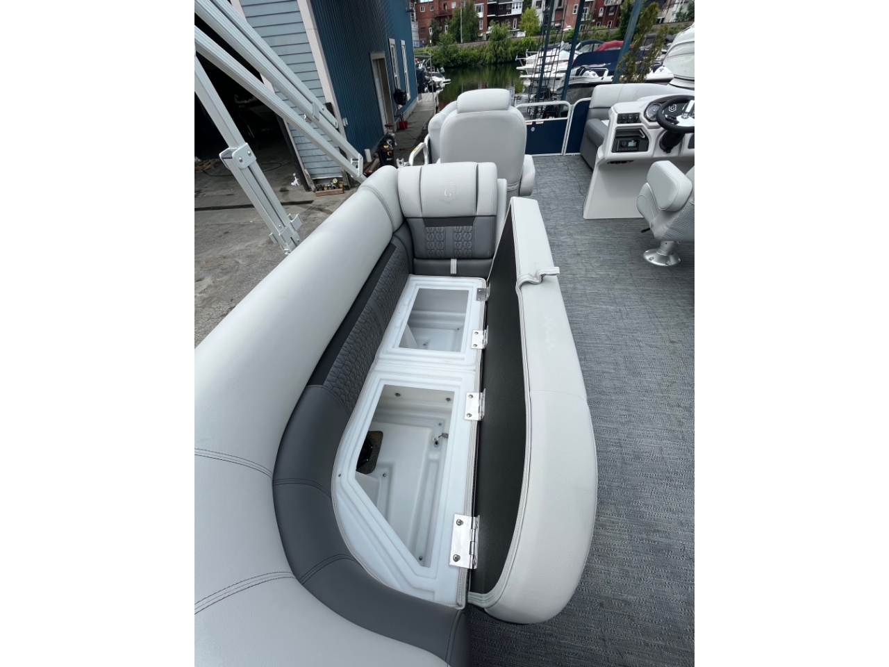 Ponton 21 pieds 11 pouces SweetWater. Avec son moteur Yamaha de 115HP et la configuration de 3 tubes, il a une capacité de 10 personnes. Extérieur de couleur bleu marin et son intérieur de couleur luxe gris Lunar et une conception des bancs séparés de chaque côté du ponton.