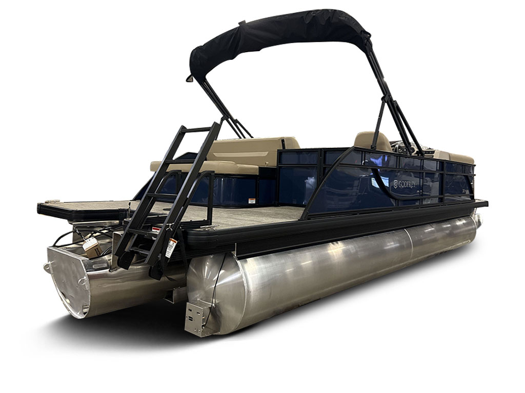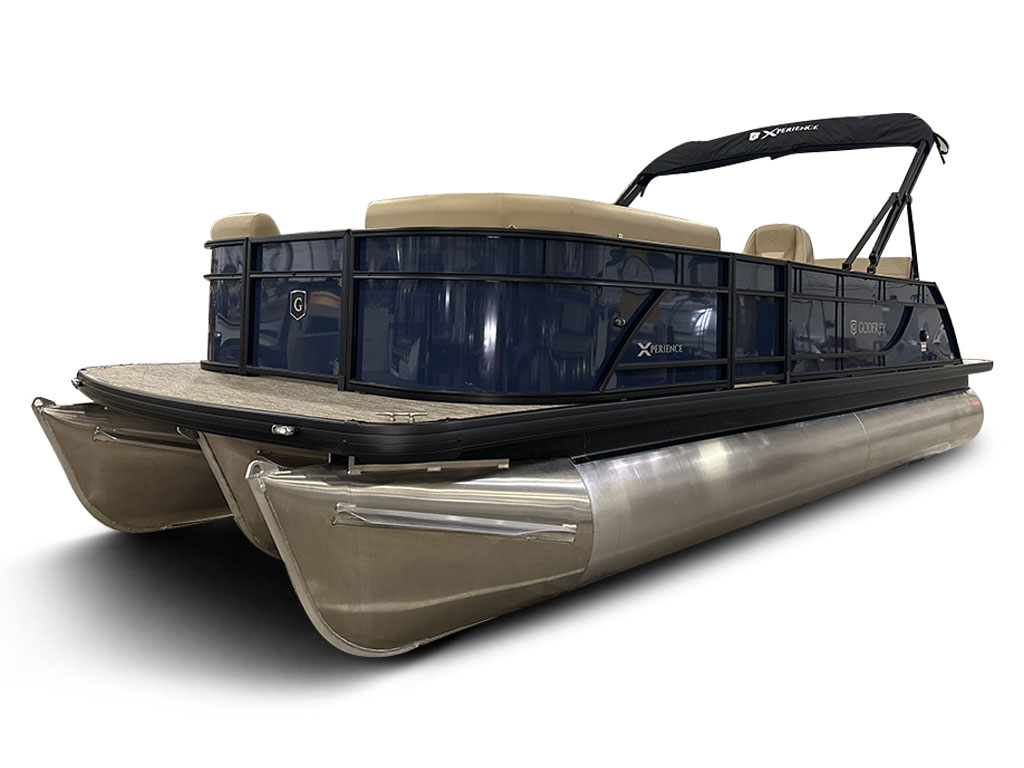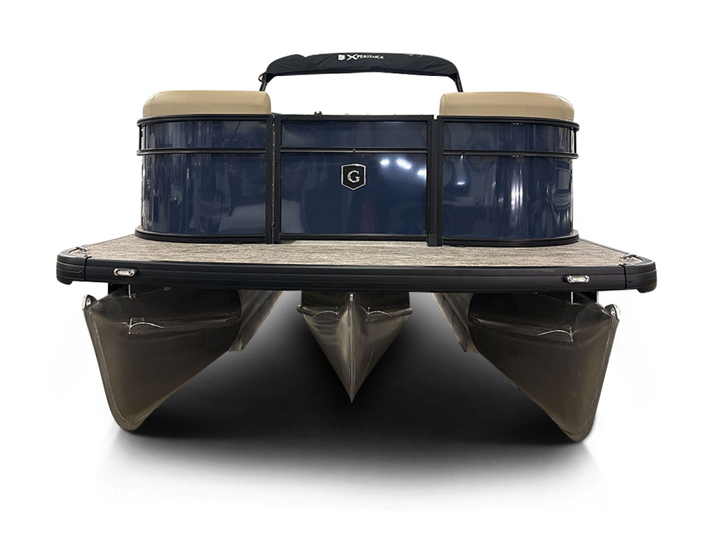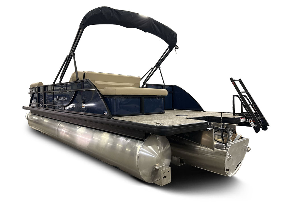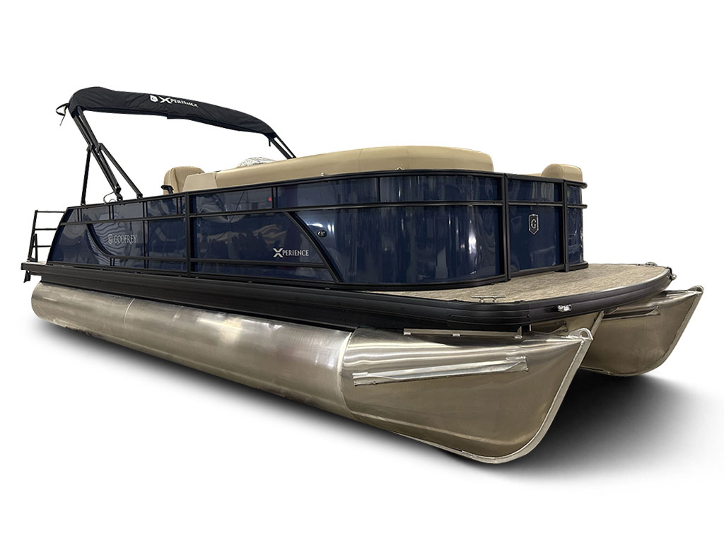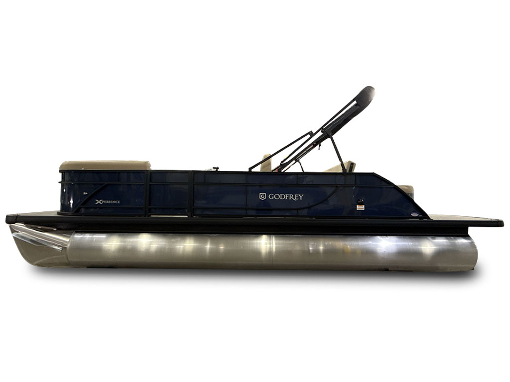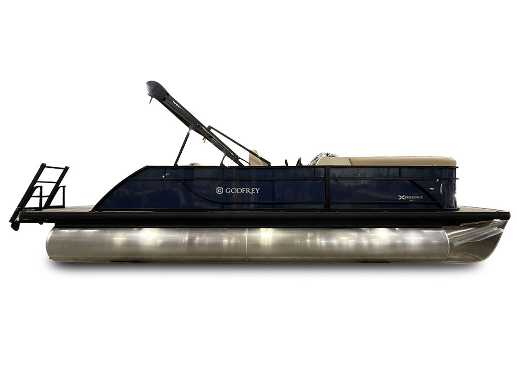 Ponton Godfrey Xperience 2286SFLX, 23 pieds de couleur Navy incluant le forfait Midnight. Avec son moteur Yamaha VF115LB et sa configuration intérieur Single Flip Lounge, au couleur Autumn Tan, il a une capacité de 11 personnes. Sa banquette amovible arrière permet d’être assis en regardant vers l’avant ou l’arrière et peut créer un lit pour profiter du soleil.