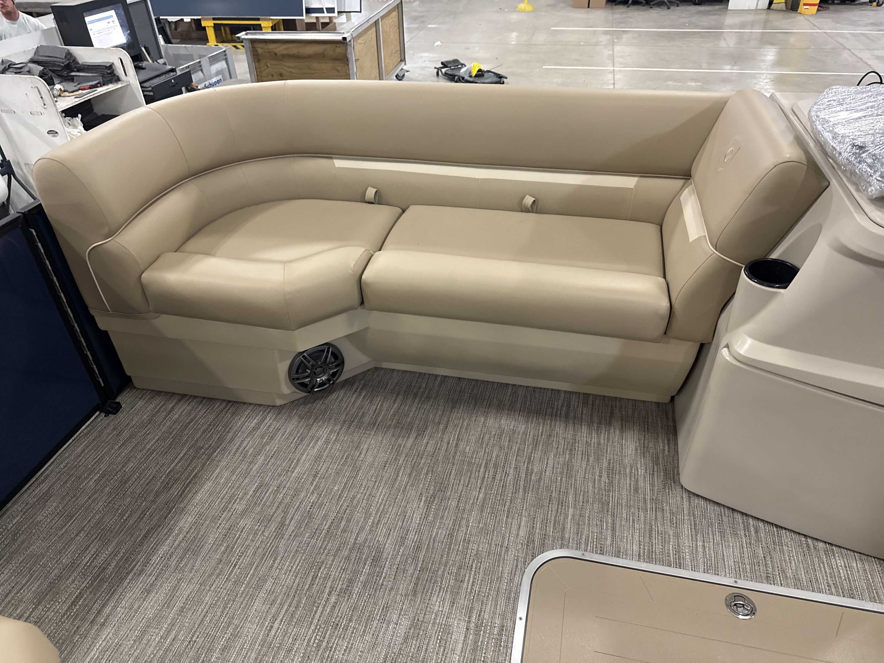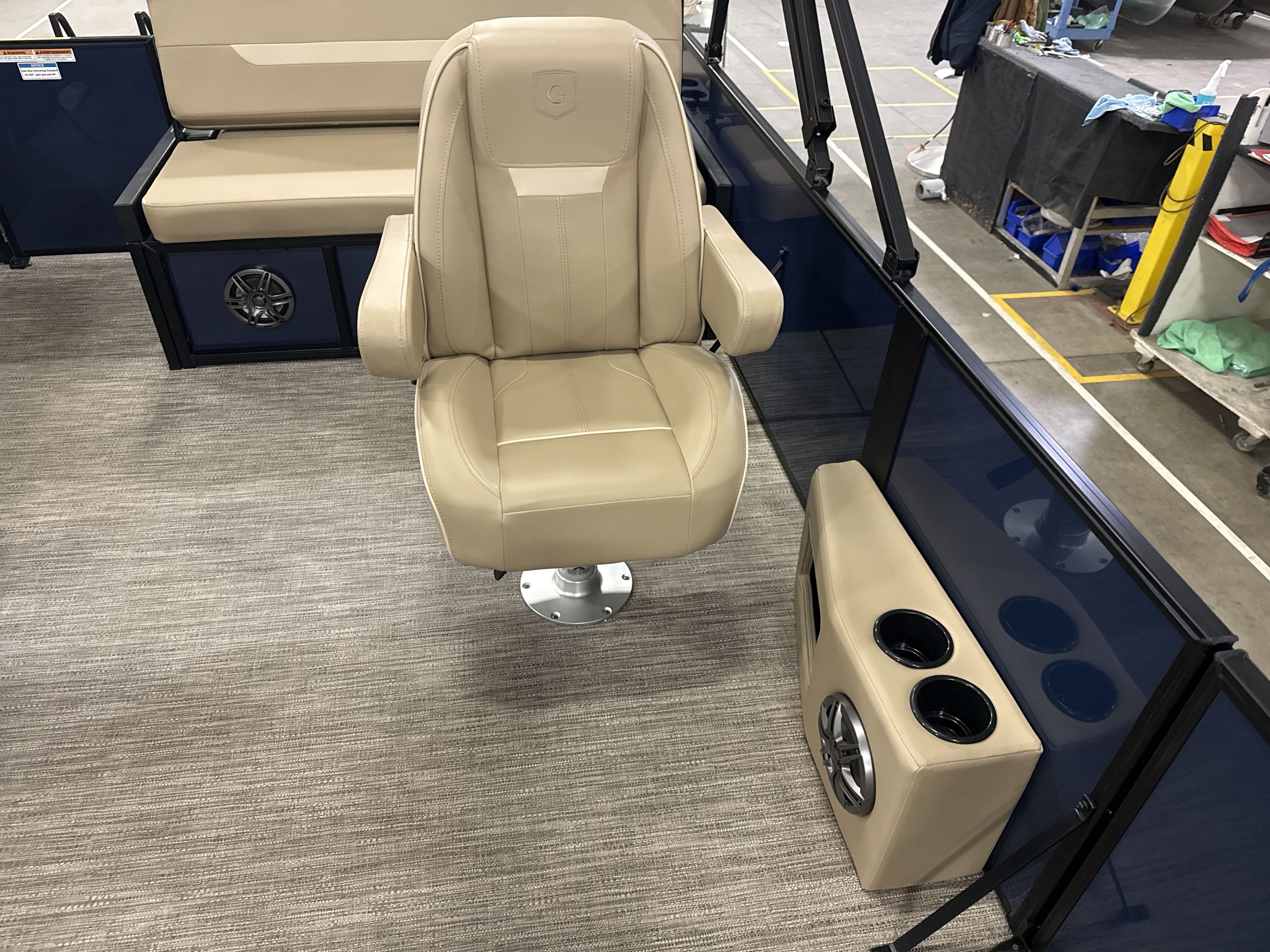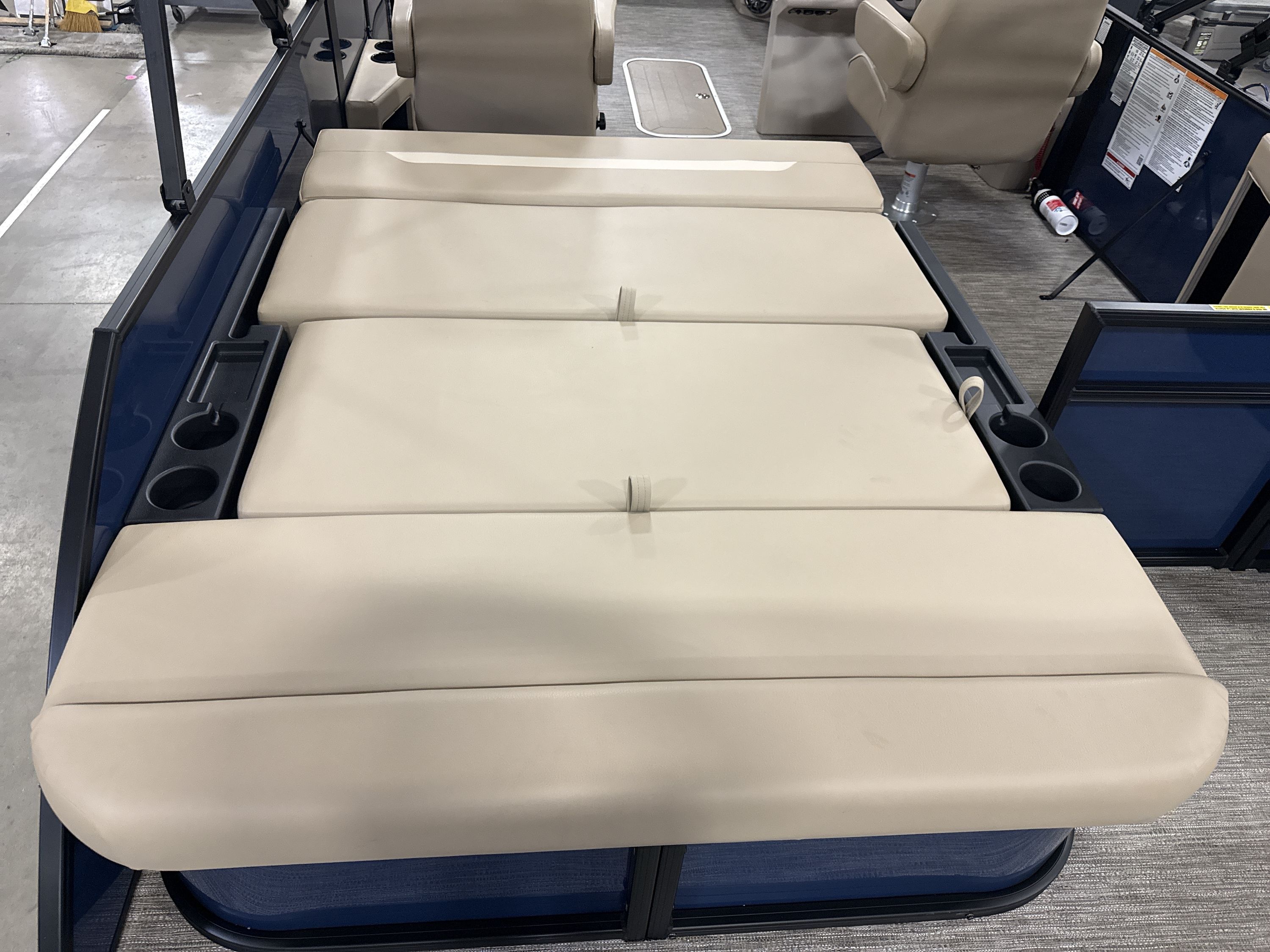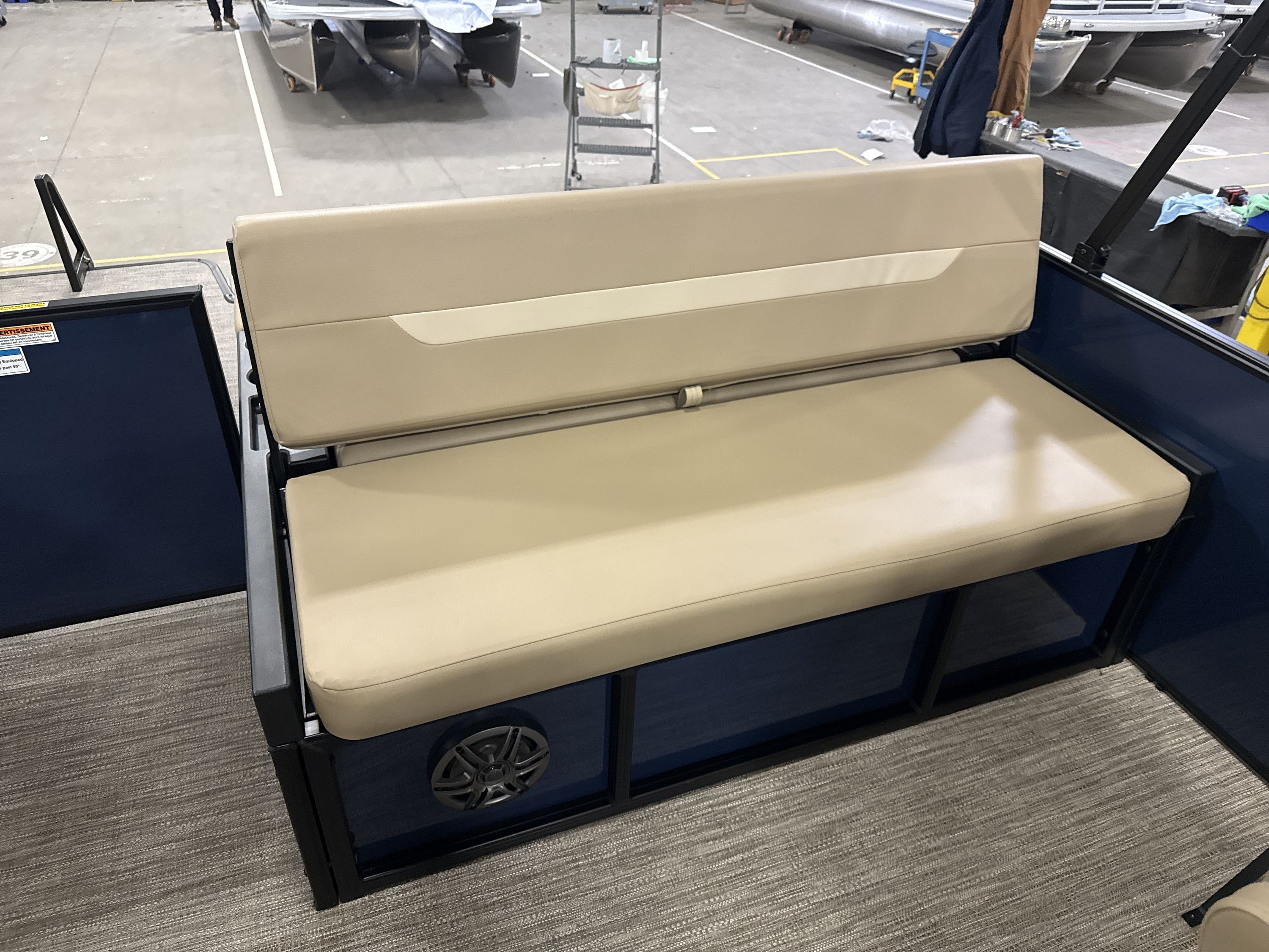 Ponton Godfrey Xperience 2286SFLX, 23 pieds de couleur Navy incluant le forfait Midnight. Avec son moteur Yamaha VF115LB et sa configuration intérieur Single Flip Lounge, au couleur Autumn Tan, il a une capacité de 11 personnes. Sa banquette amovible arrière permet d’être assis en regardant vers l’avant ou l’arrière et peut créer un lit pour profiter du soleil.